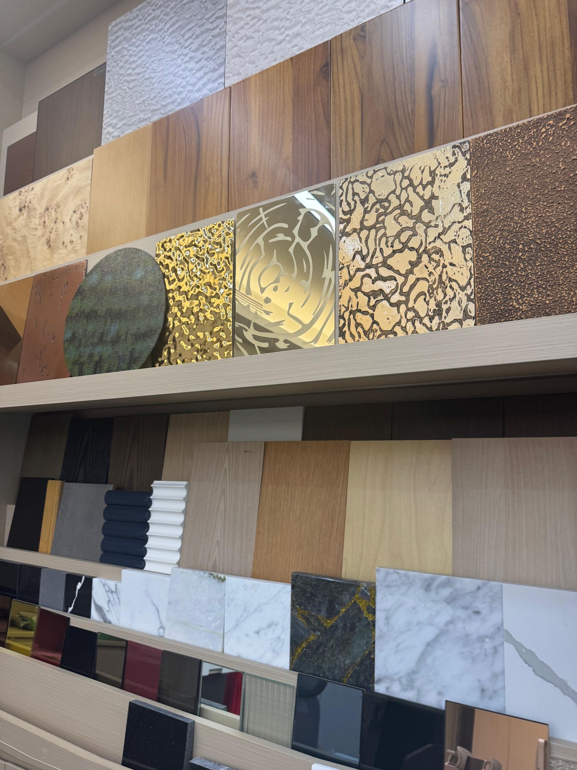 Laminates, veneers, stone, and hardware aligned with project palettes.
